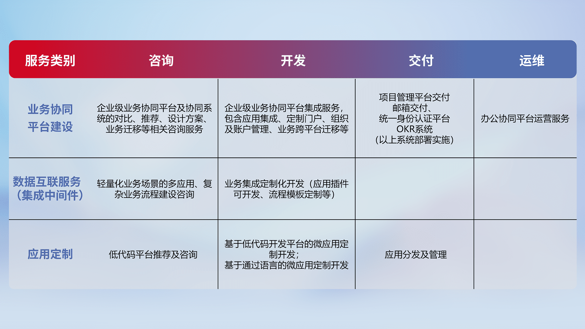 针对钉钉、、企微、、、、IDaas等平台级产品提供产品的规划、、、方案、、、、交付、、定制化开发等服务,,,实现如统一协同办公、、智能客户服务、、、混合会议管理、、、智能数据查询、、、等业务场景,,实现数字化转型。。